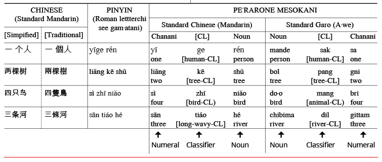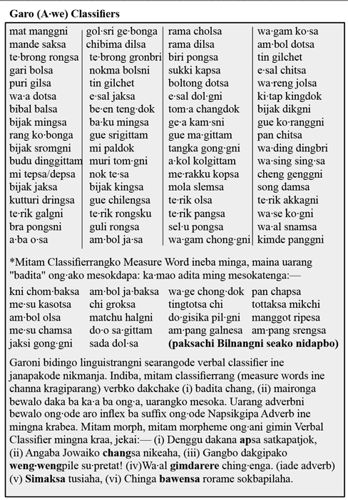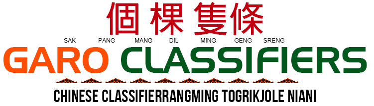 A·chikkuo gita apsangipa classifierrang Salaram Asiani ku·sikrango gnang:— bo·roma, ro·dronga, dal·gapa, do·o, mat, mande, matburing — iarang pilakkon ma·ate minge chanani gnang. Uarangni sentenceo biap ra·anirangsan adita dingtanggrikaia, jekai Garochi “do·o mangsa” inode Chinese Mandarino biap ra·ani “sa mang do·o” ine ong·skaa. A·chikkuo gita, noun plural ong·oba classifierde dingtangja.